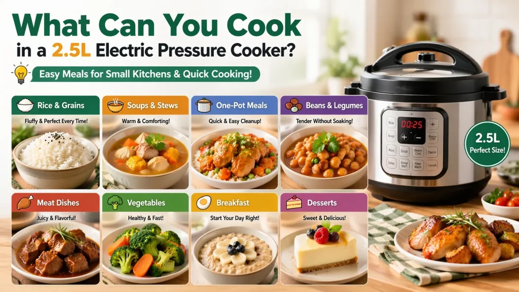 Although the size is smaller in 2.5L electric pressure cooker, it has a very large range of dishes to cook in different cuisines.